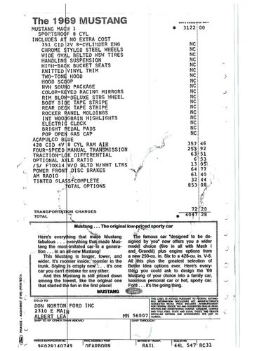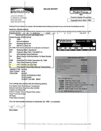 1969 was a benchmark year in United States history with Neil Armstrong becoming the first person to step foot on the moon as a product of American engineering and innovation. The Mach 1 Super Cobra Jet Mustang was about as iconic as it gets in the automotive industry at the time. Made specifically for drag racing and competing against the Chevrolet Camaro. This is a well-documented, beautiful Mach 1 428 Cobra Jet with the drag pack and ram air option. This particular Mach 1 has lived a good life and has underwent a total restoration in 2001. The suspension has all been rebuilt to OE specs, the 428CJ engine has been rebuilt using all 1969 NOS or era correct parts and the paint shines like you wouldn't believe. Being a true time capsule to 1969 with the original AM radio, interior design/color, engine specs, exhaust, wheels/tires and styling. You would be hard pressed to find another one in this good of shape.