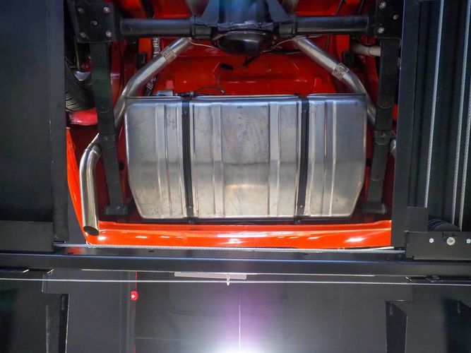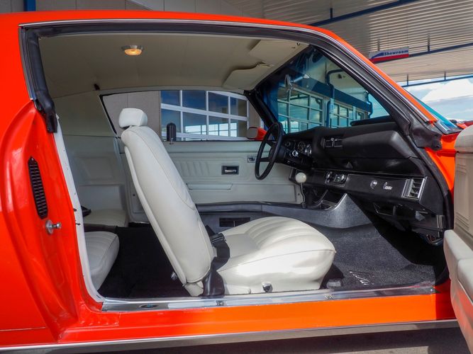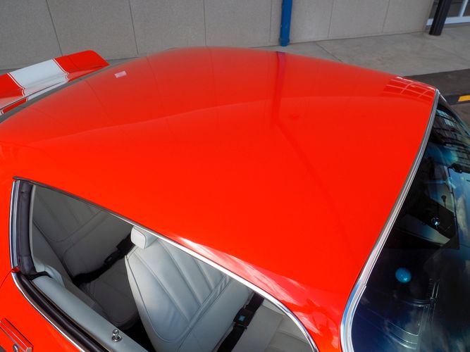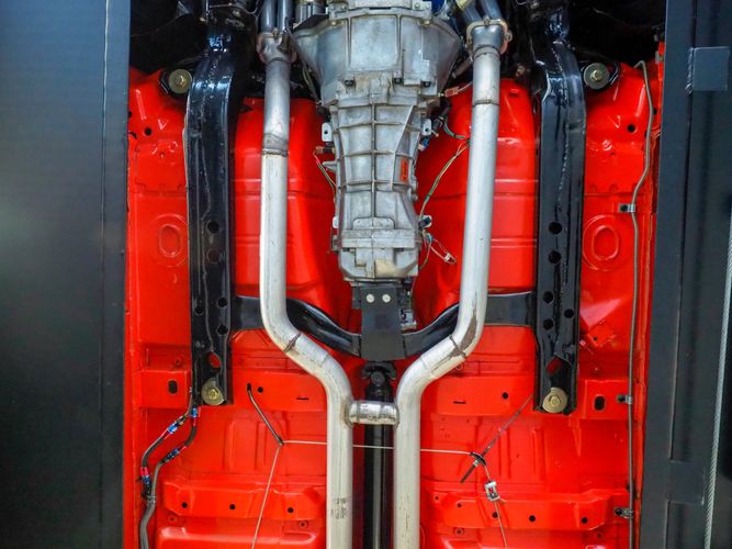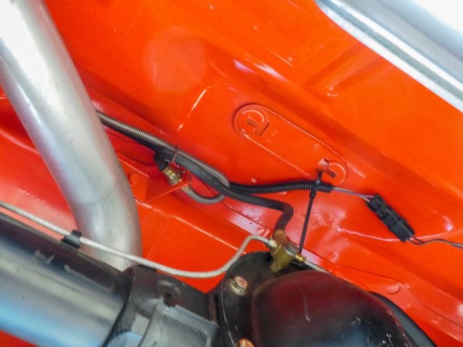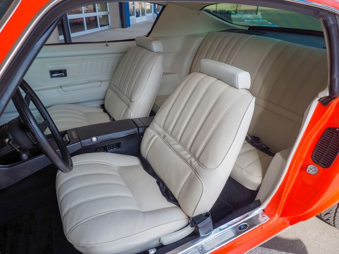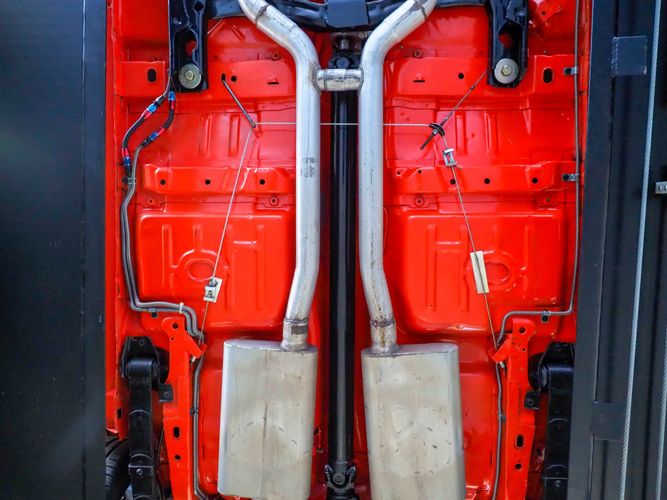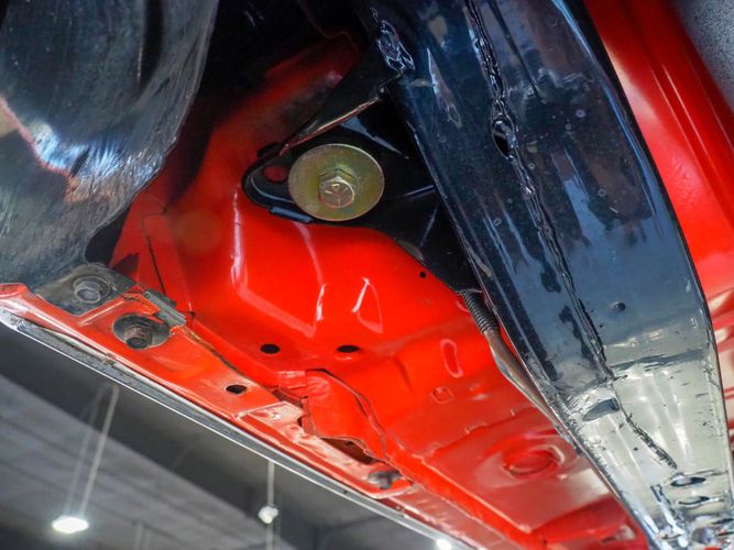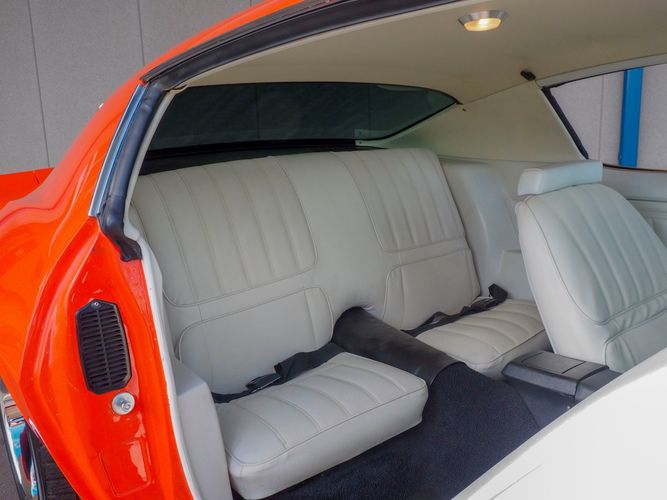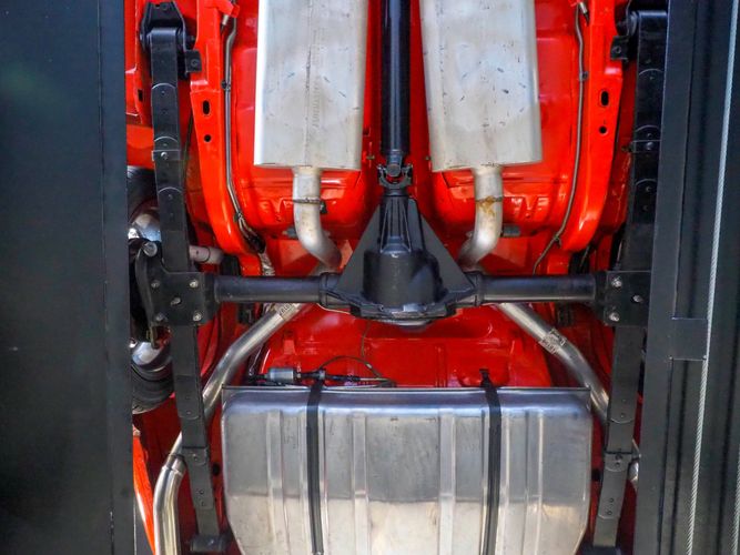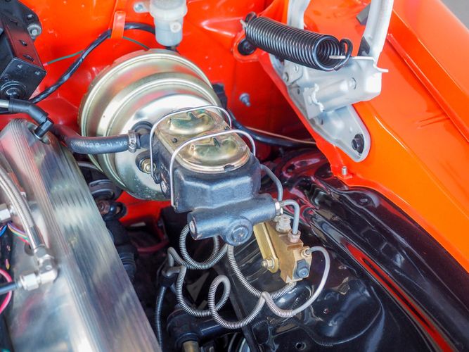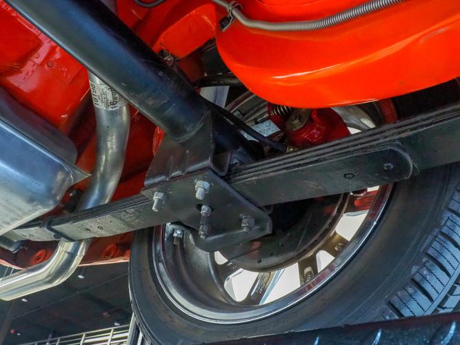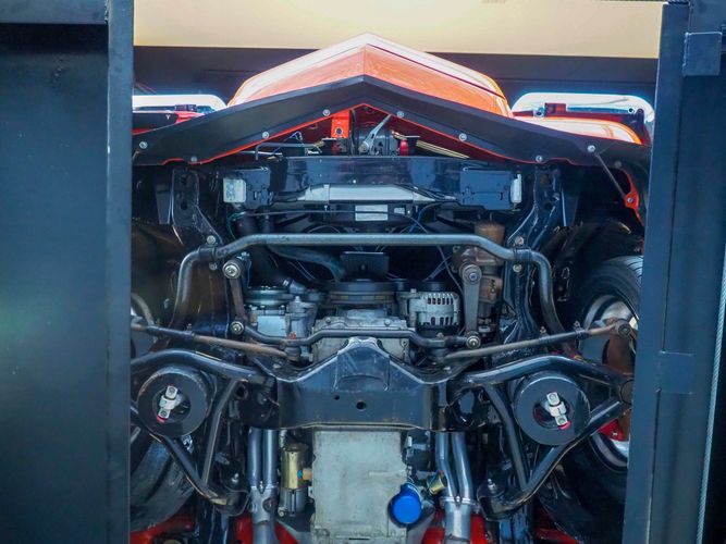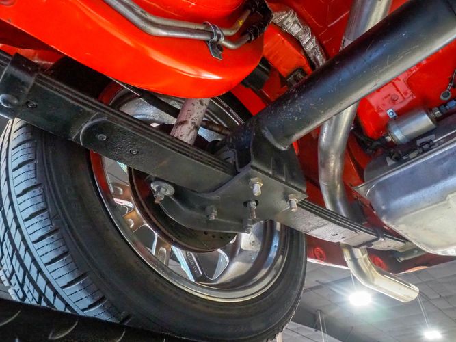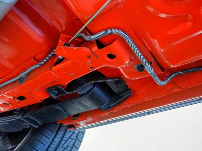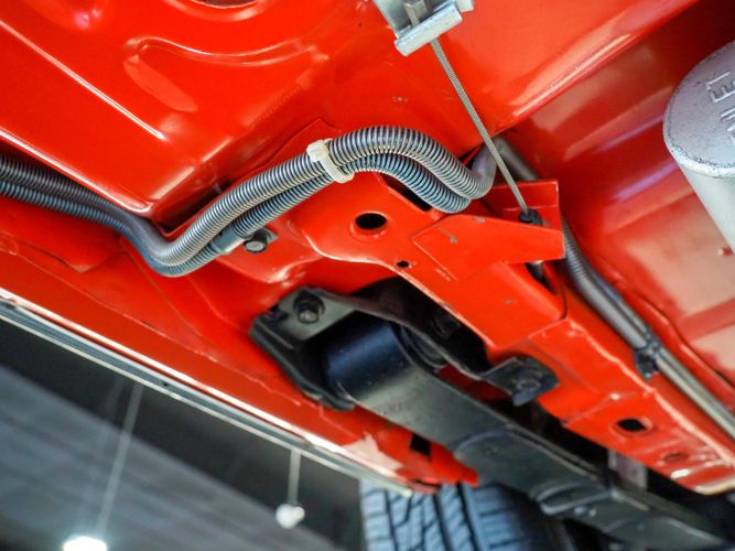 The body was fully restored on a rotisserie and the entire underside and top side was finished in this beautiful Hugger orange paint. White stripes were added and then everything was clear coated over. The suspension then was re-assembled on the ultra clean body. The undercarriage is complete with all brand new brakes lines, fuel lines, wiring, gas tank, and all new rubber front to back. The tubular front A-arms were added to allow for better handling and the 4-wheel disc brakes were added for safety and quick stopping power.