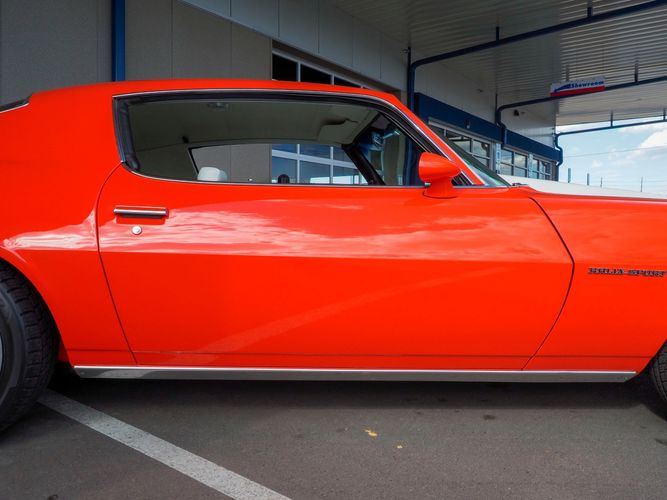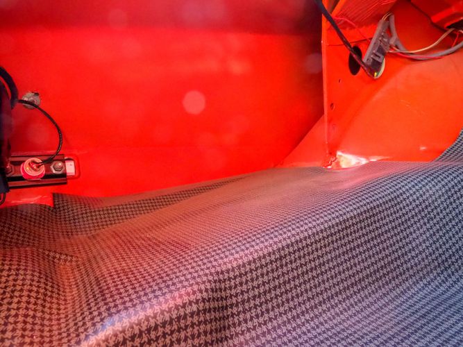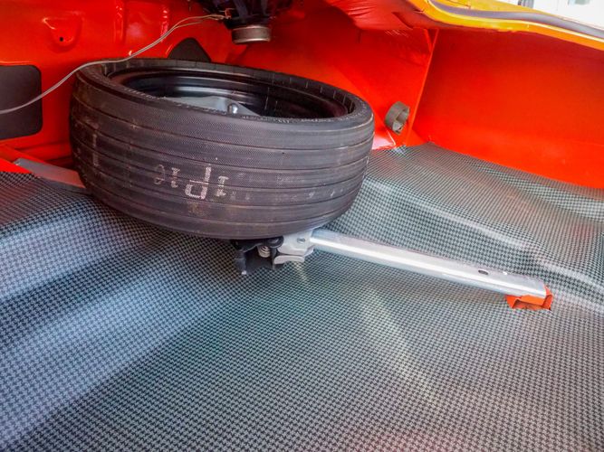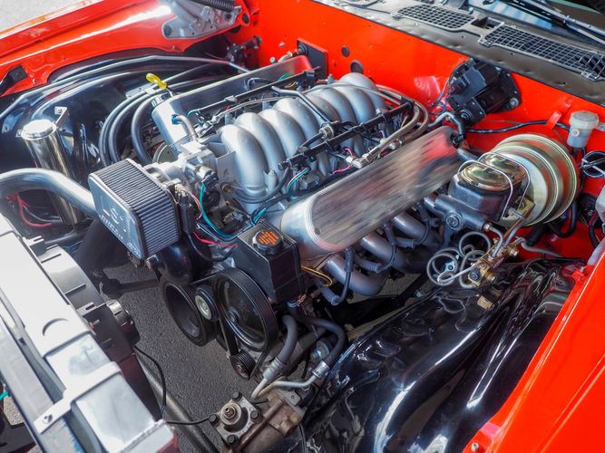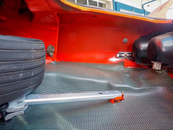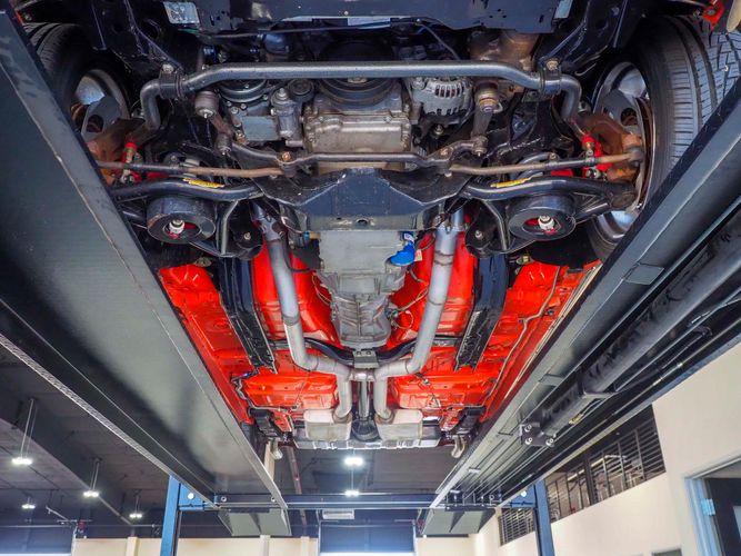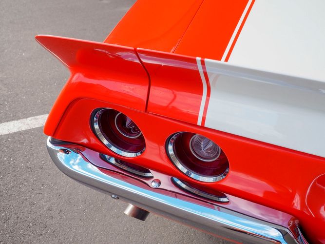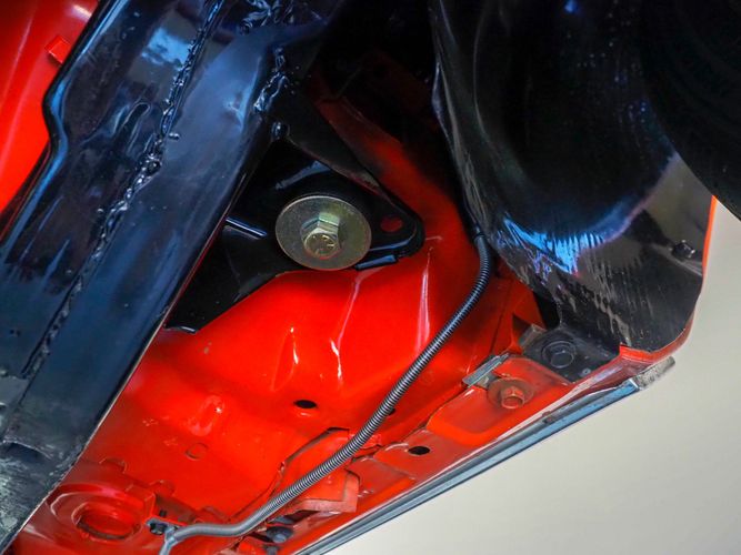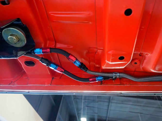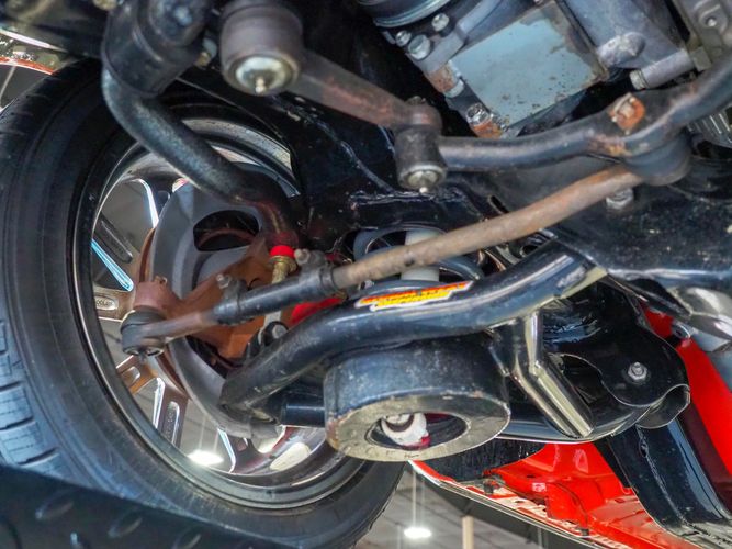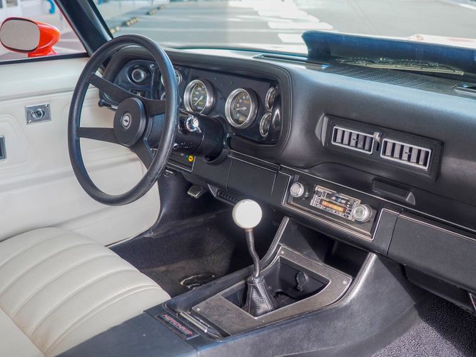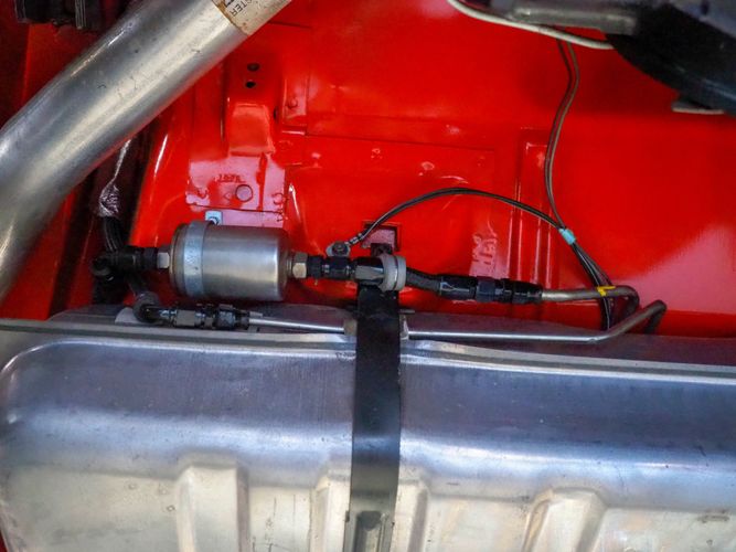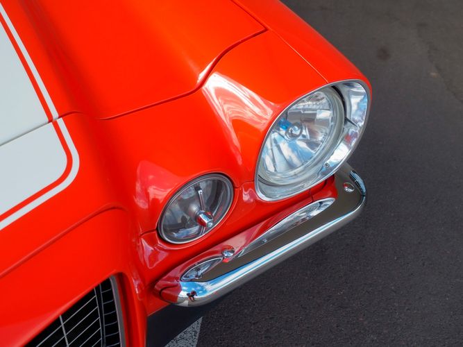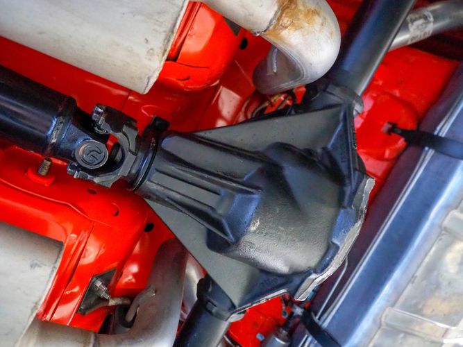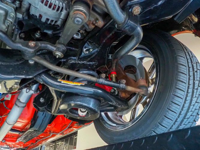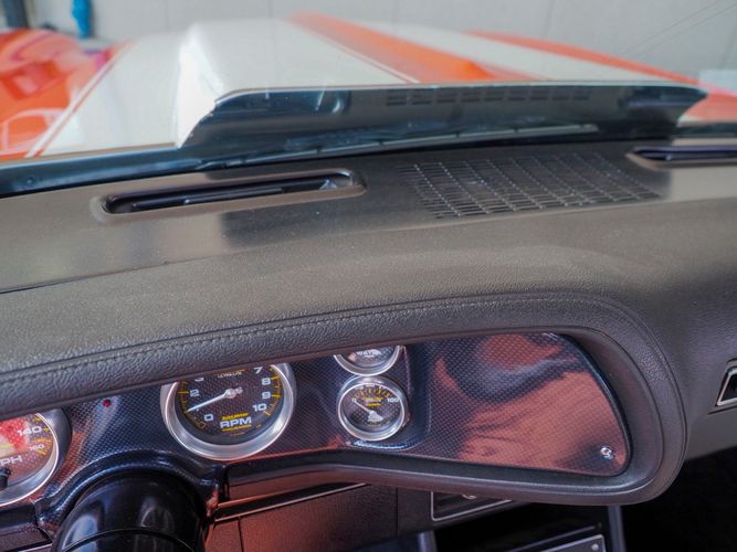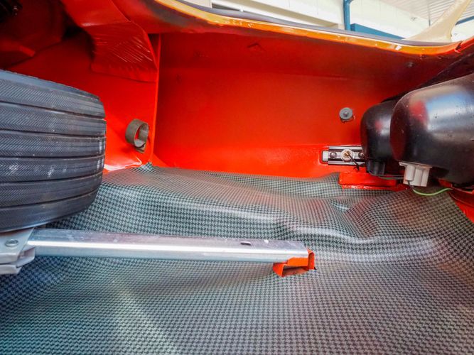 The body was fully restored on a rotisserie and the entire underside and top side was finished in this beautiful Hugger orange paint. White stripes were added and then everything was clear coated over. The suspension then was re-assembled on the ultra clean body. The undercarriage is complete with all brand new brakes lines, fuel lines, wiring, gas tank, and all new rubber front to back. The tubular front A-arms were added to allow for better handling and the 4-wheel disc brakes were added for safety and quick stopping power.