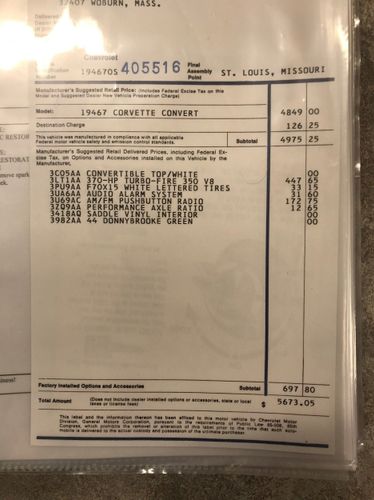 This is a 5-time NCRS top-flight winner fully restored in its original Donneybrooke Green over a saddle interior. Equipped with its original LT1 350/370hp with a Muncie 4-speed and independent rear suspension with performance axle ratio option.