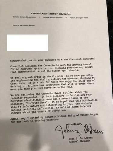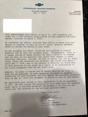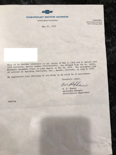Offered by Cars Remember When is this one owner unrestored 1970 Corvette that is a very well documented Colorado car with low miles. The current title is dated 1987 and states 96,000 miles, meaning it was driven ruffly 2000 miles in the last 30 years! The paint is in good condition and shows very well. The black vinyl interior is completely original and in excellent shape, the seat covers, carpet and dash all look very clean. Complete with two sets of t-tops; the one photo'd and a glass set. This is a prime collector car that has withstood the test of time and will continue to appreciate in value. Included are letters from GM's 1970 general manager John De Lorean congratulating the owner on his Corvette purchase. Additional letters follow explaining a delay in production due the current GM strike (see end of photo gallery).
