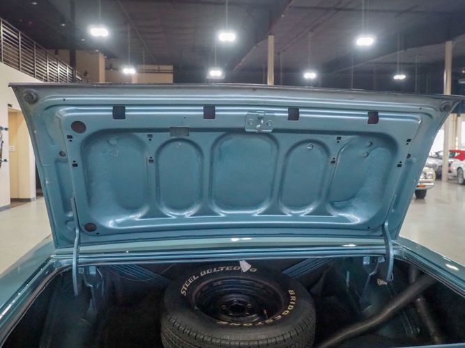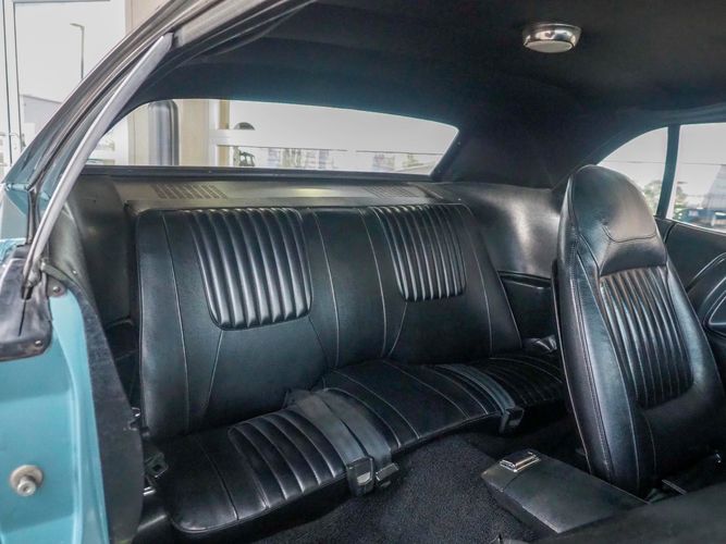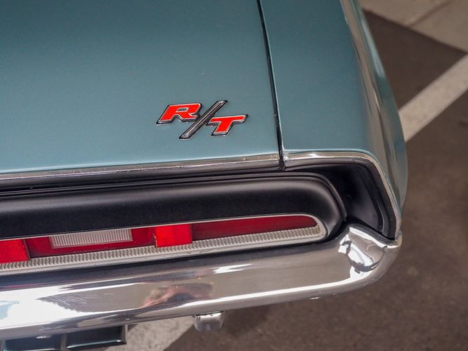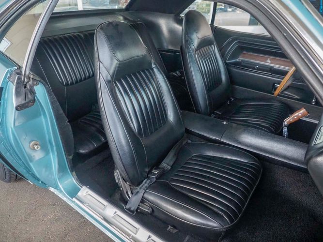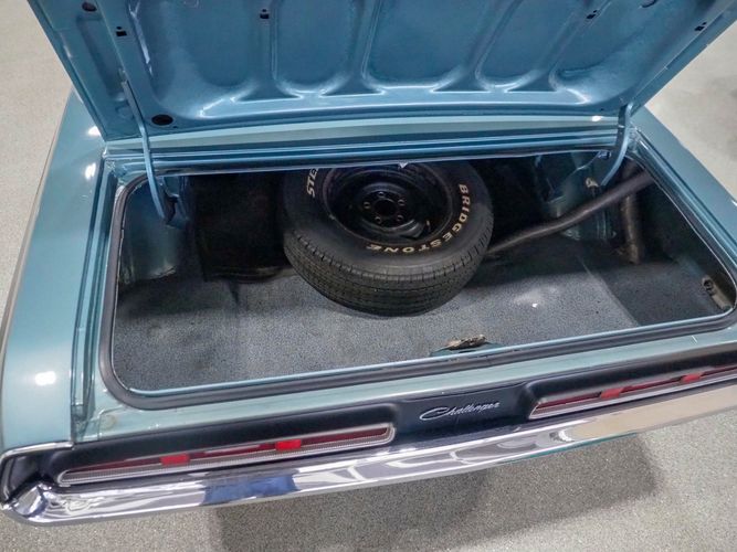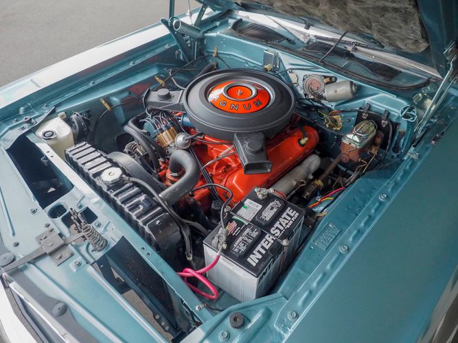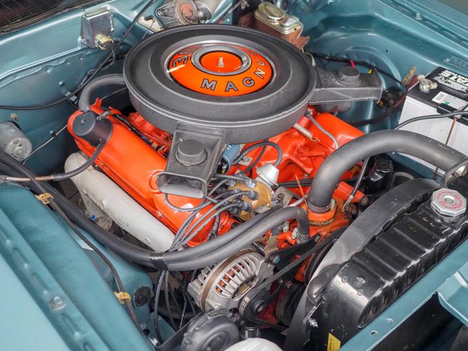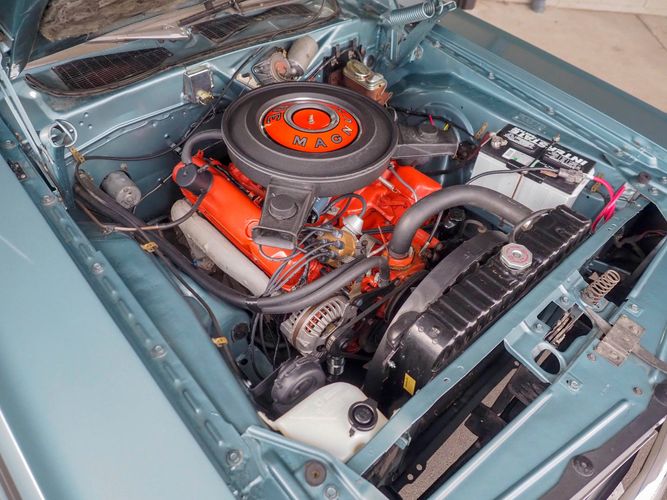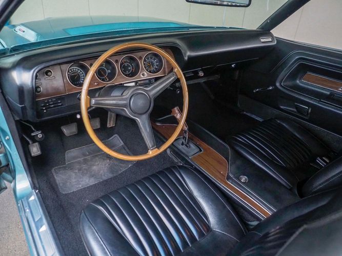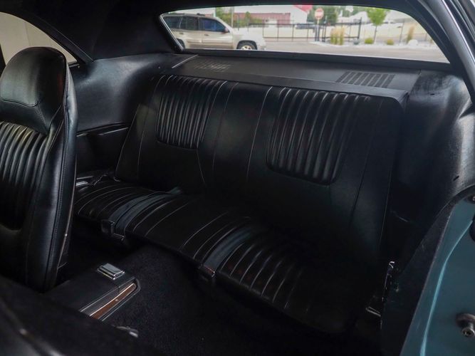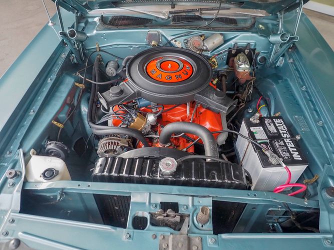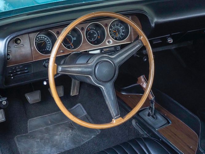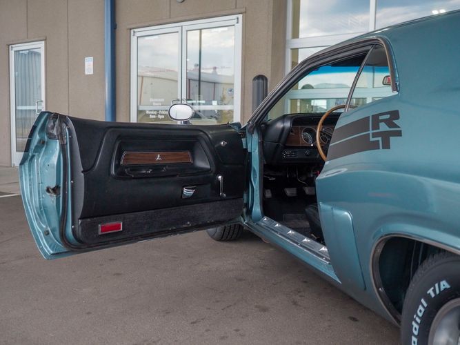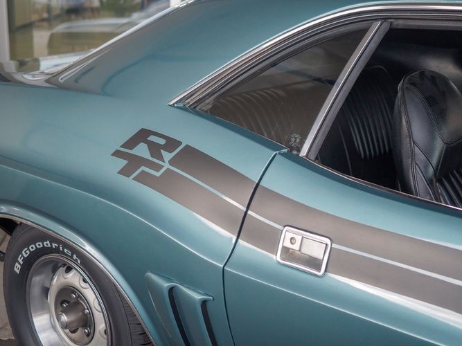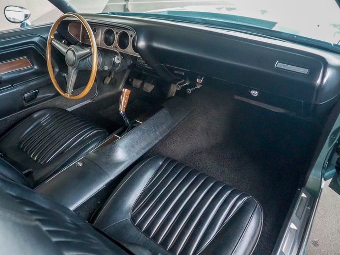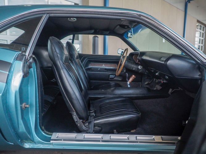 This car was given a complete rotisserie restoration, and the proof is in the details. The panels expertly fit together, and the factory-correct Light Gunmetal paint shines nicely. Even more shine comes from the bumpers, hood pins, and the 15-inch Rallye wheel trim. Complete with sharp-looking black R/T longitudinal stripes that accent the body lines. The interior is nicely restored with black vinyl bucket seats, center console, and heat & defrost.