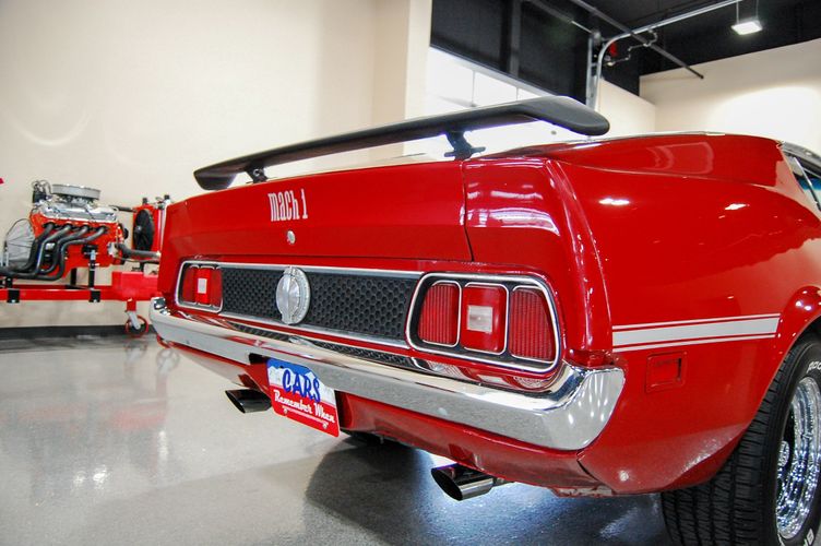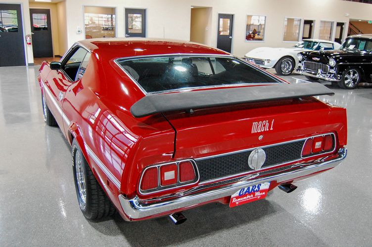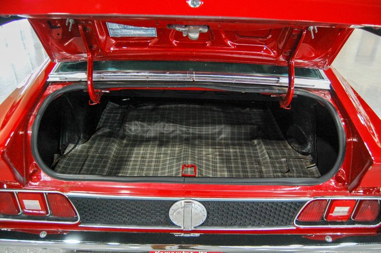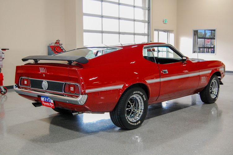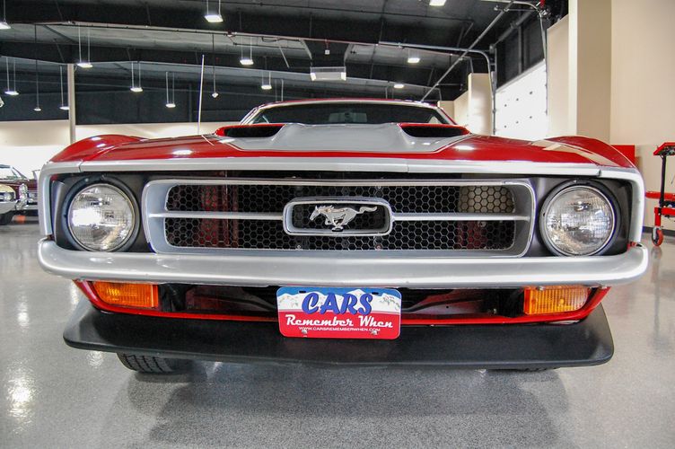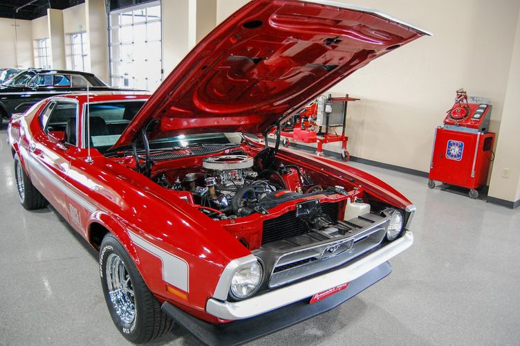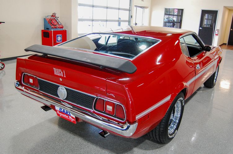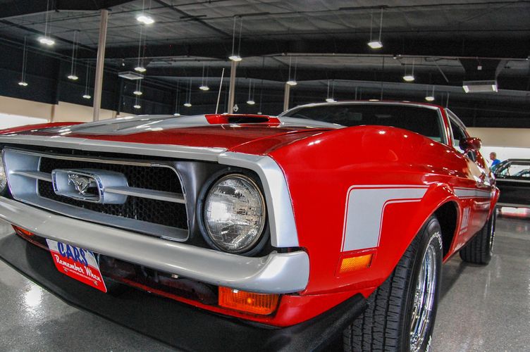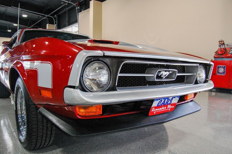 With Mustang production numbers dwindling each year after the 1965 model year due to competition, they made a total of 151,484 cars in 1971 with only 36,499 being fastback Mach 1s. This Mach 1 was originally a blue car and is now a candy apple red with white racing stripes. This car is the perfect driver to take out and have fun but not worry about every little pot hole or paint chip. The built 351 Cleveland small block sounds mean, has plenty of low end torque, and is an absolute blast to drive with the 4 speed. The Mustang suspension rides smooth, handles well and has been rebuilt to OE specs. The interior package is very luxurious with the black leather bucket seats, center mount gauges, and topped off with the Hurst Shifter. Overall this Mustang shows very well, drives great and is a head turner anywhere you take it!