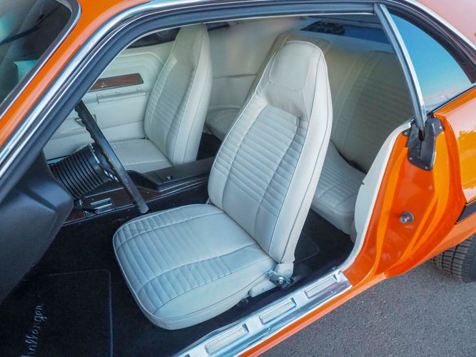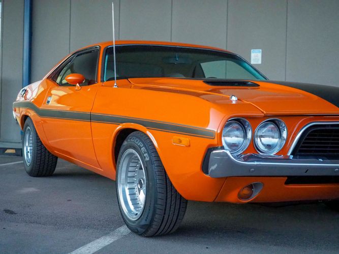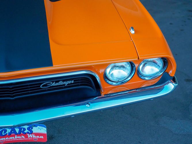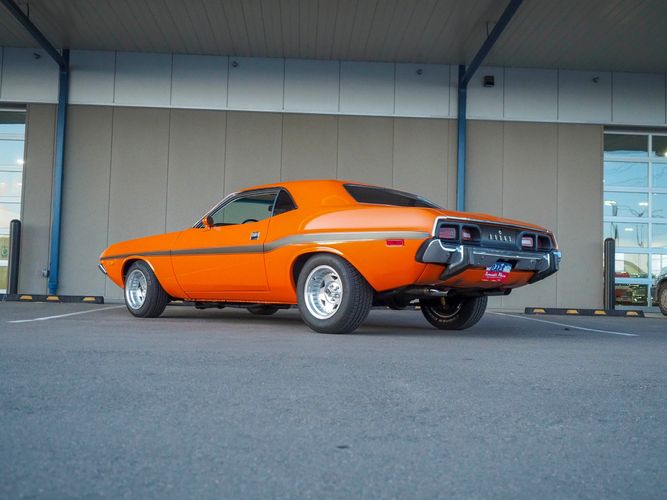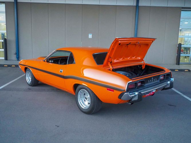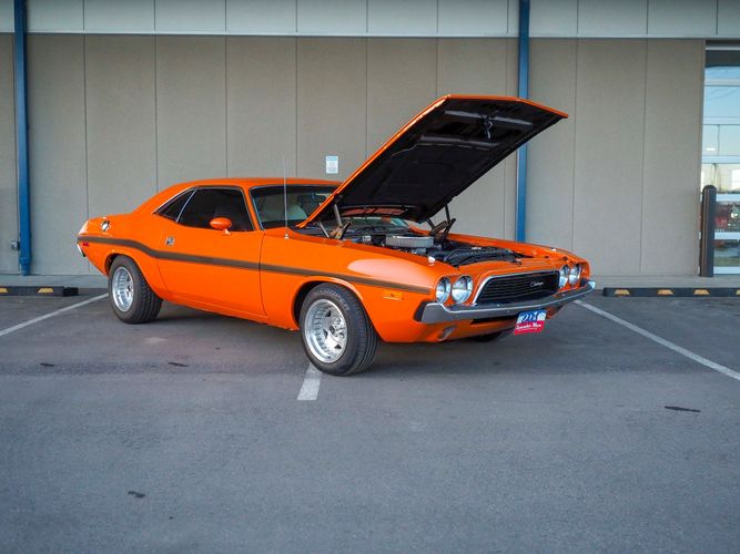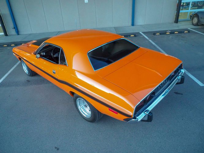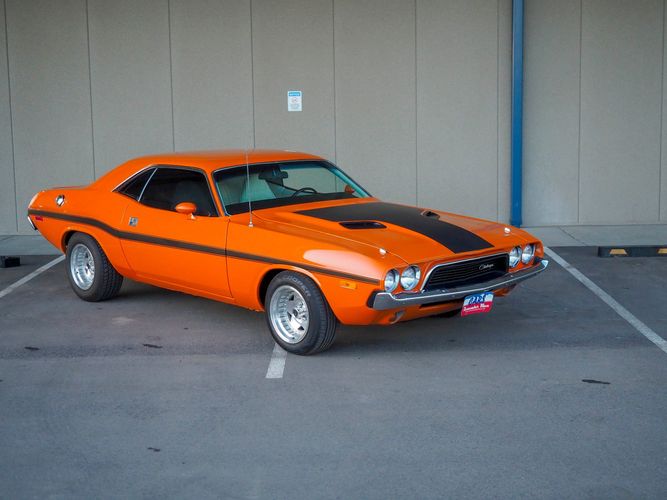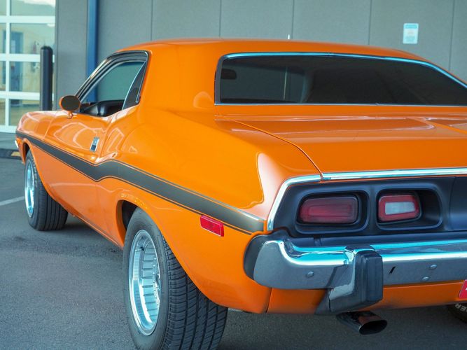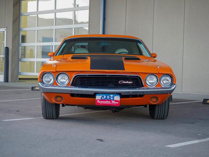 Offered by Cars Remember When is this outstanding 1973 Challenger with new orange paint, a fresh 360 V8, automatic transmission, power steering, and a clean white vinyl interior. This car is recently restored and ready for its next owner. The paint finish is excellent and shows very nice. The door fit and finish is near perfect and both close with very little effort. The body is straight and the vibrant Omaha Orange gets head turns everywhere you go. The black stripping and new wheels set this car apart from the rest.