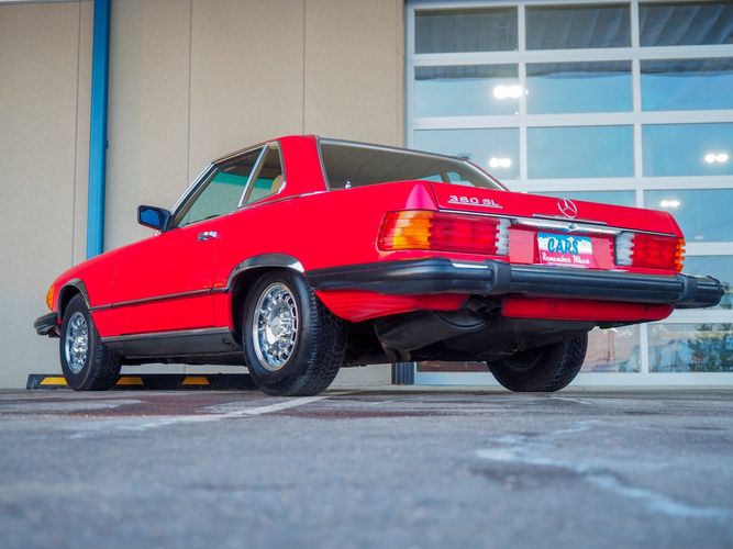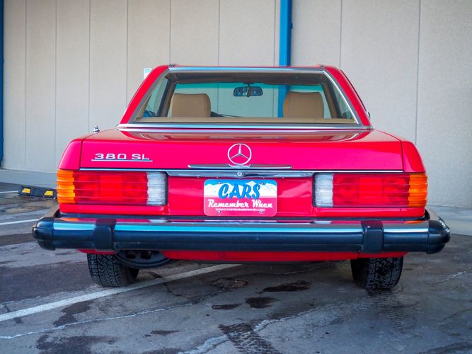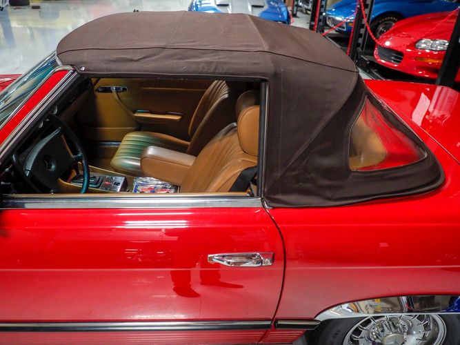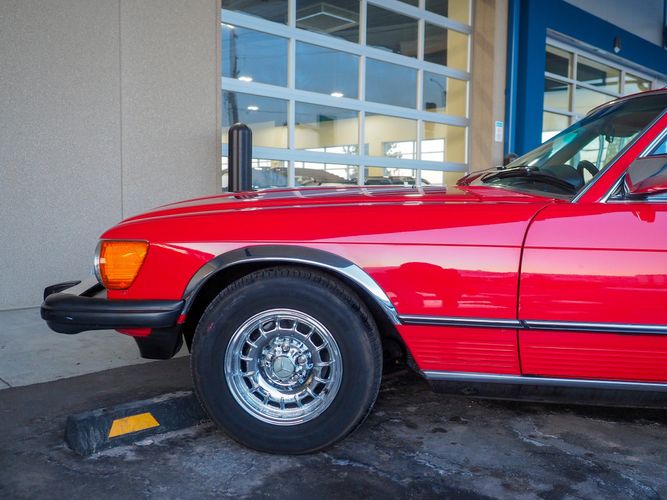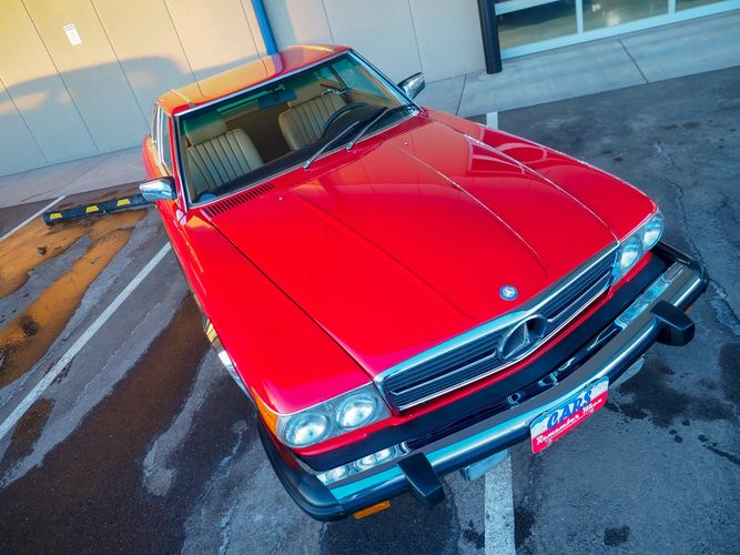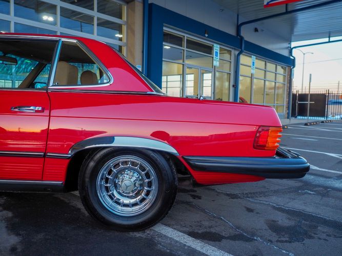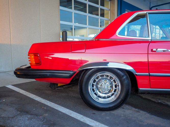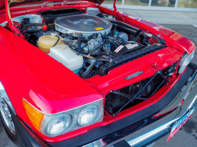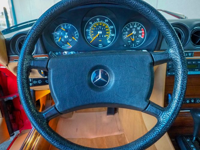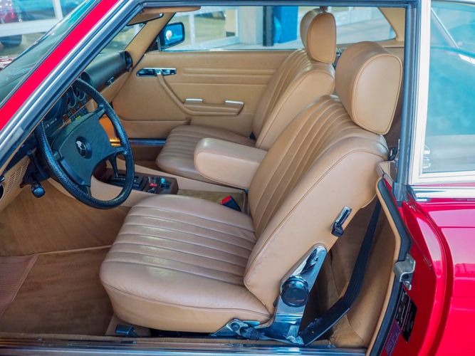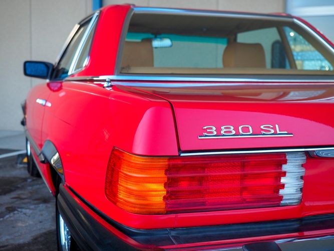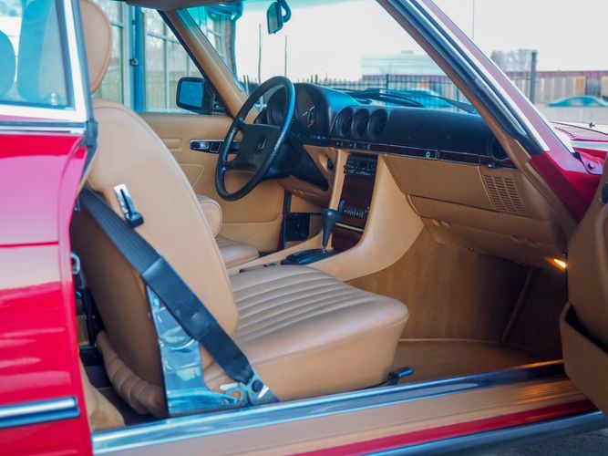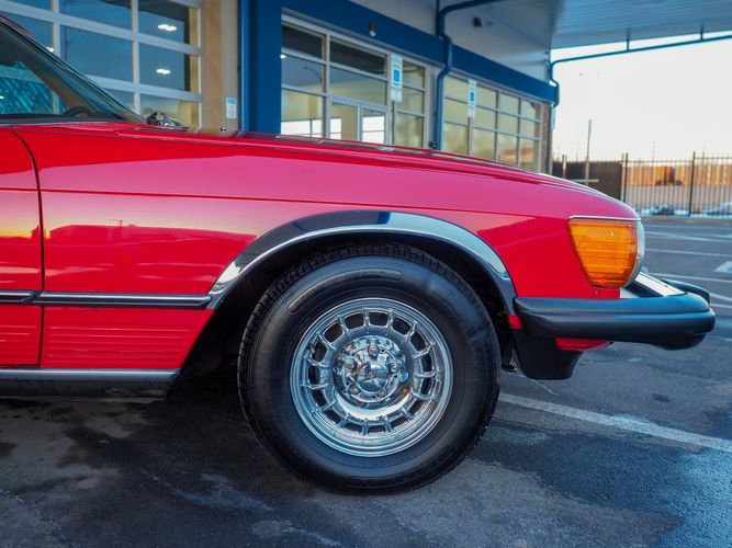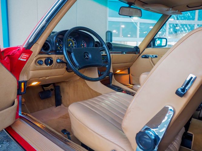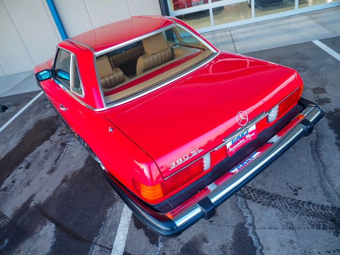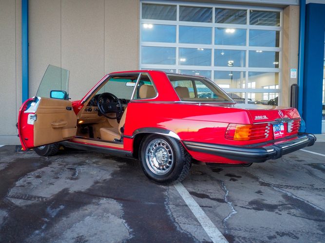 This particular 380SL comes from a good home and was extremely well cared for. It is sporting its factory original red paint in excellent condition. The body on this car is razor straight and has a great shine. Complete with factory chrome wheels, OE glass, trim and a removable hardtop, there is no classier way to get around!
