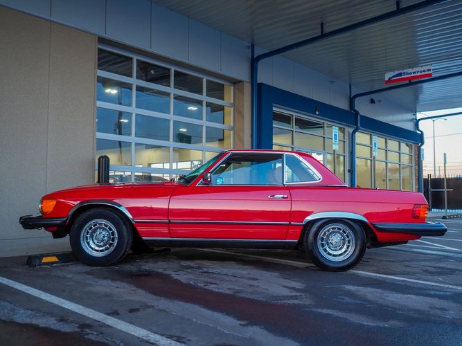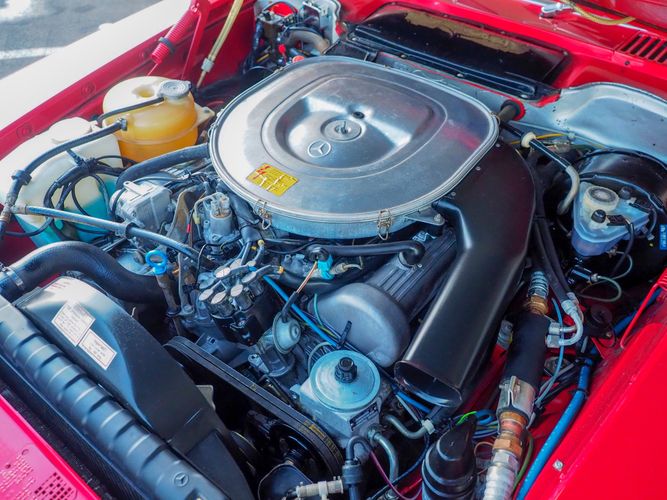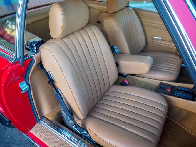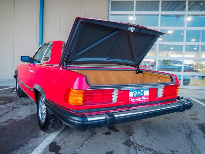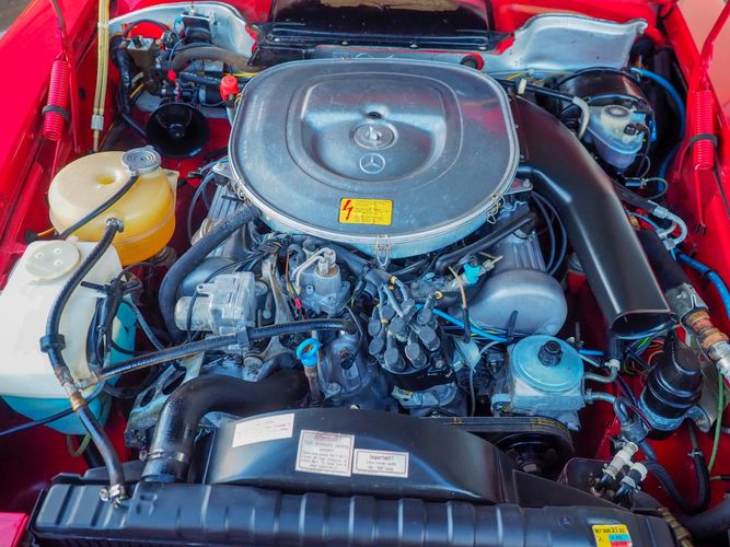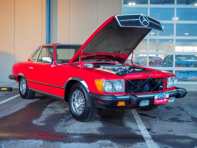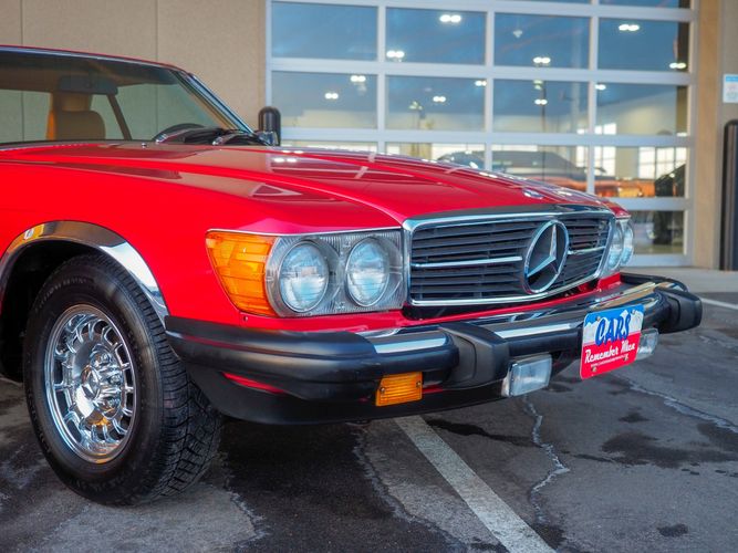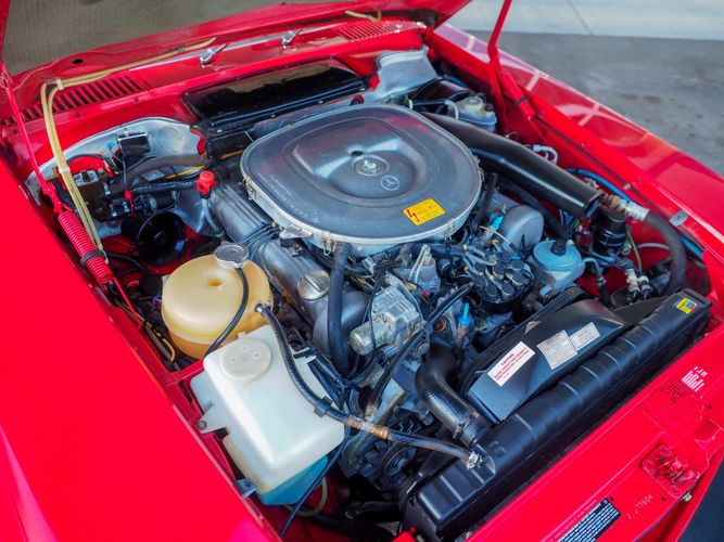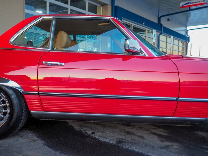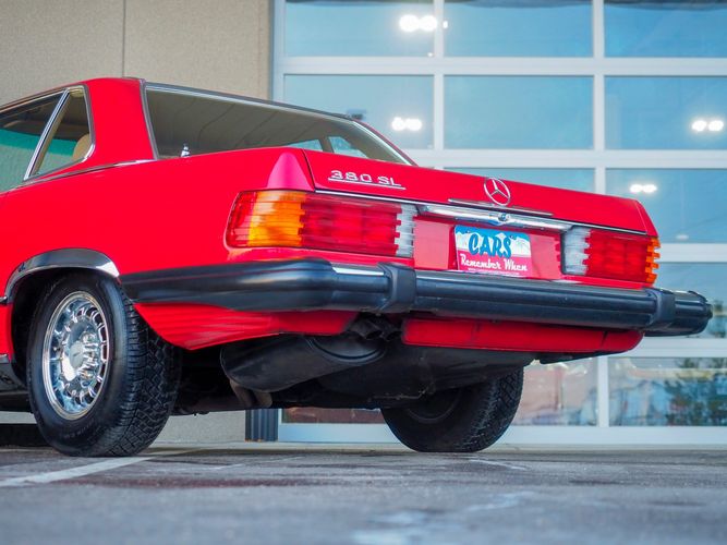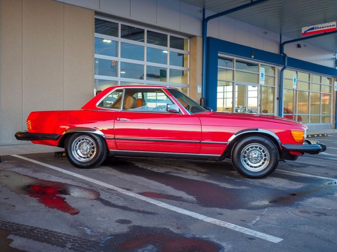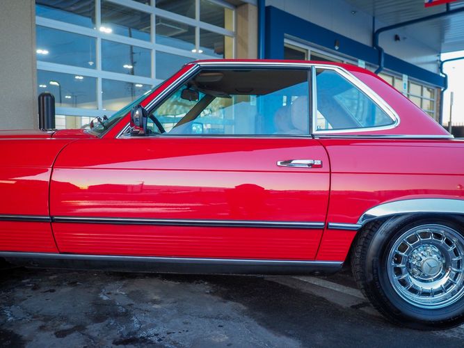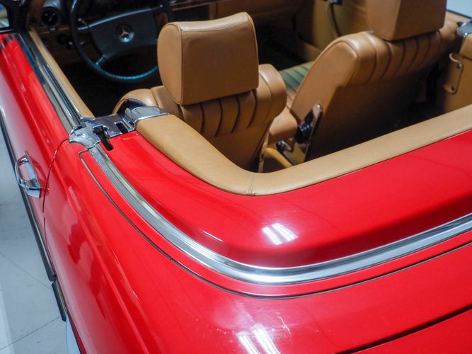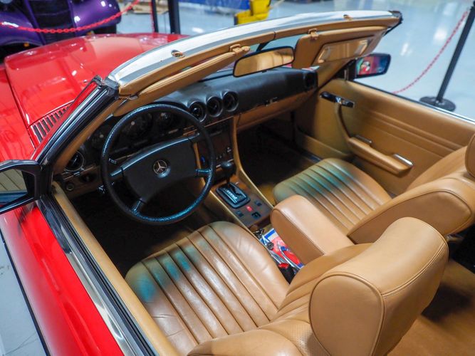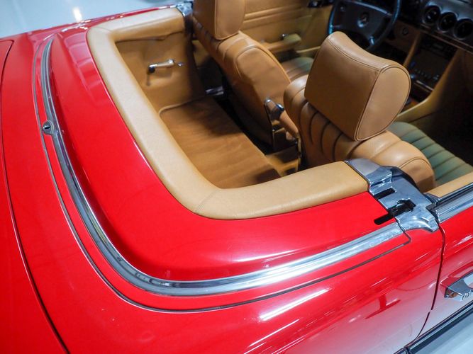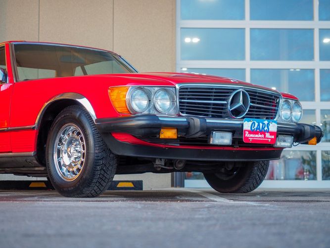 This particular 380SL comes from a good home and was extremely well cared for. It is sporting its factory original red paint in excellent condition. The body on this car is razor straight and has a great shine. Complete with factory chrome wheels, OE glass, trim and a removable hardtop, there is no classier way to get around!