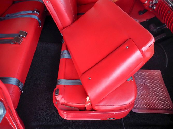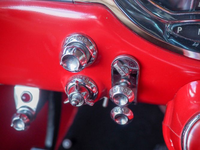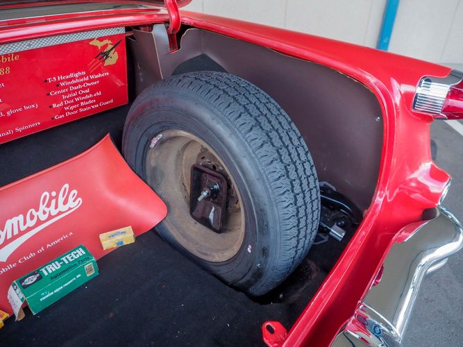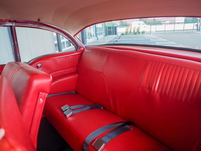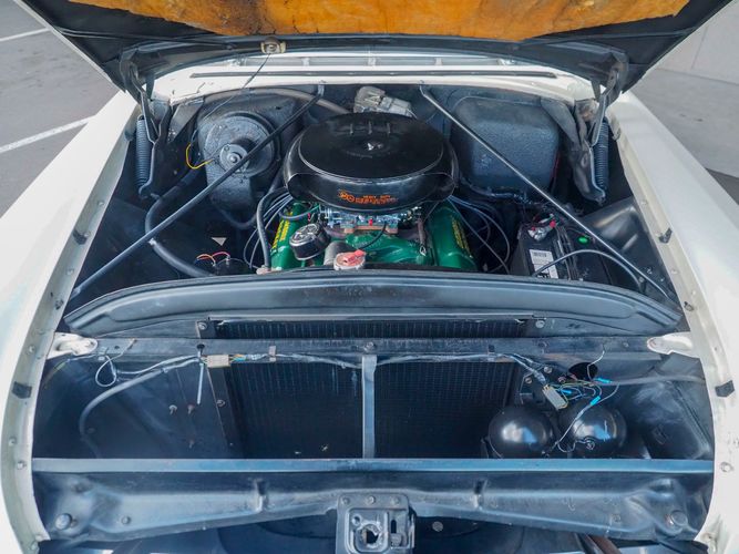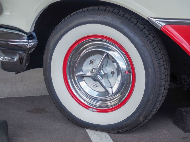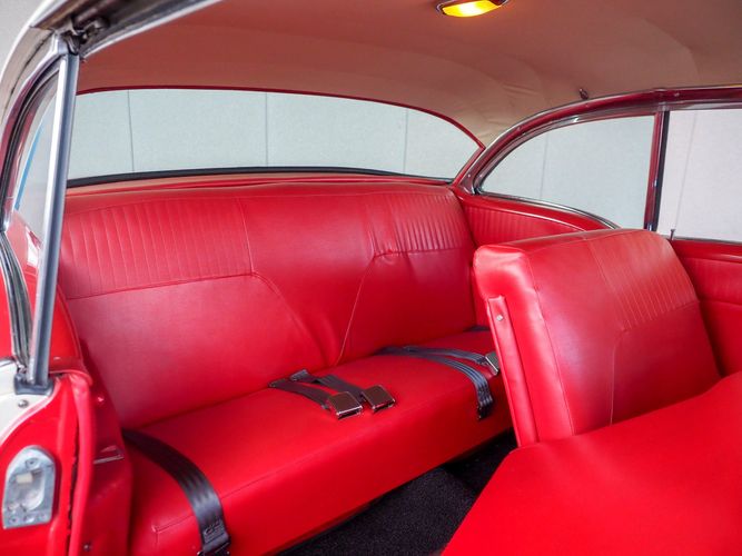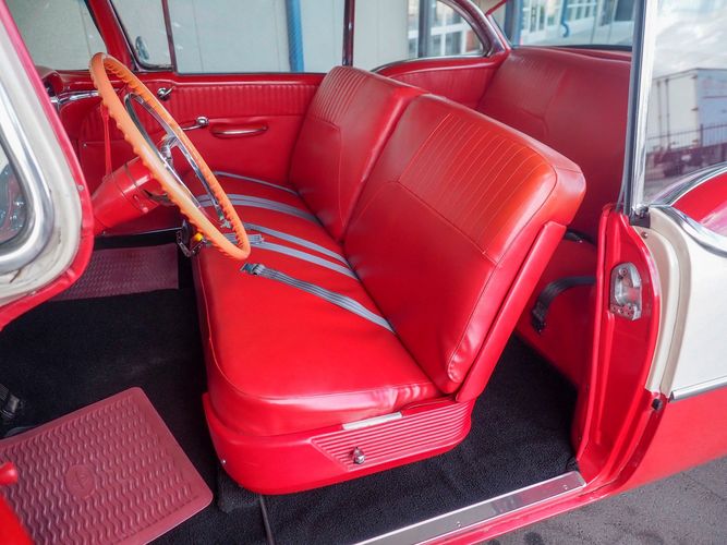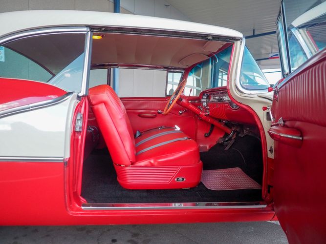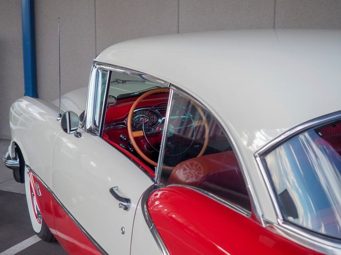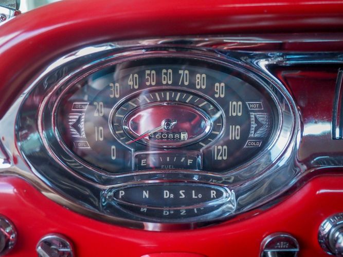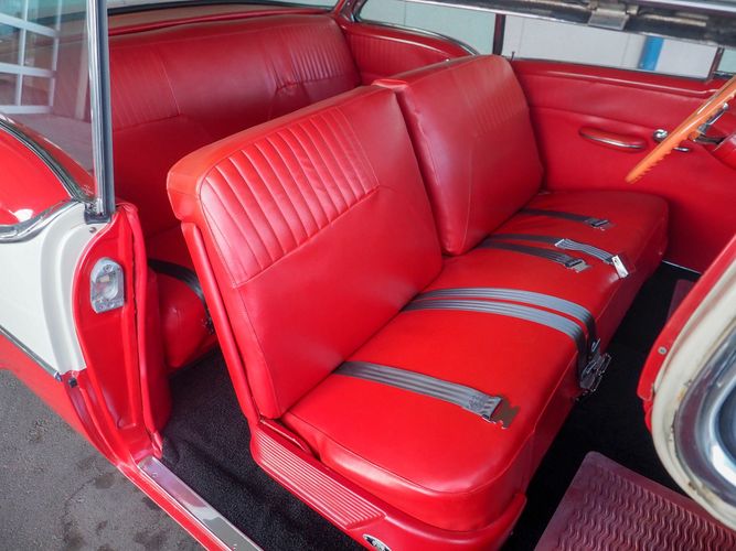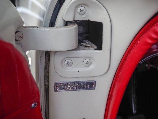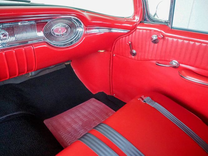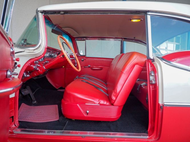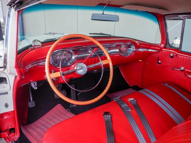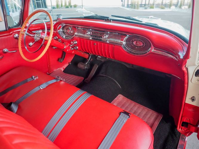 This is an excellent very-original example of a 1956 Oldsmobile 88 equipped with the optional Jetaway transmission. Finished in its original white on red colors, over a red bench seat interior give an authentic, period-correct feel. The interior is very clean, all the gauges work and the dash is in excellent shape.