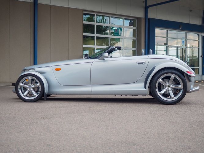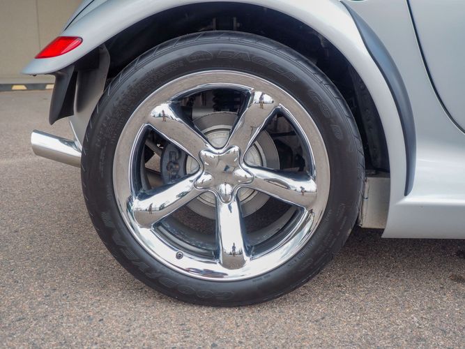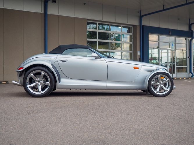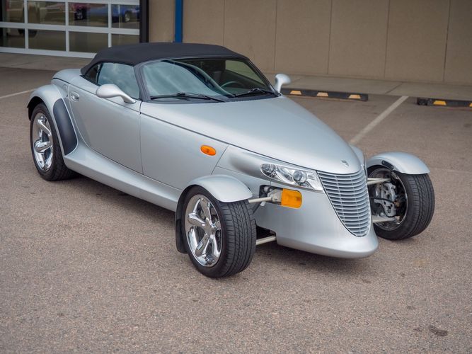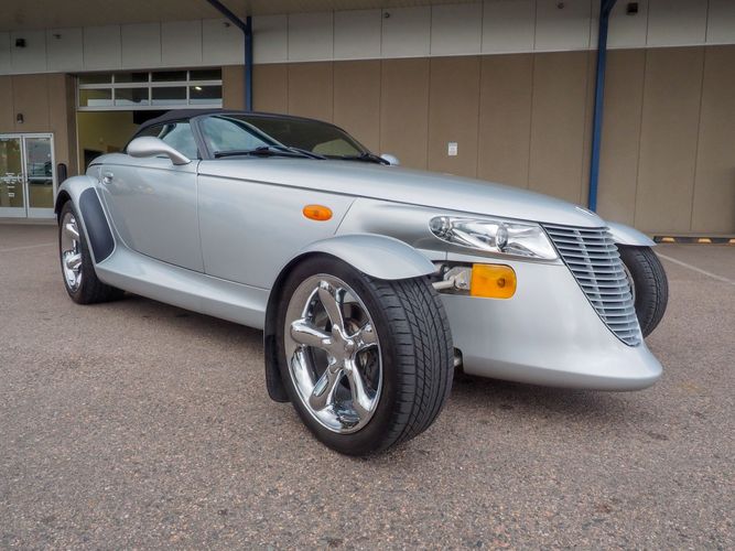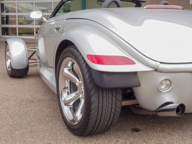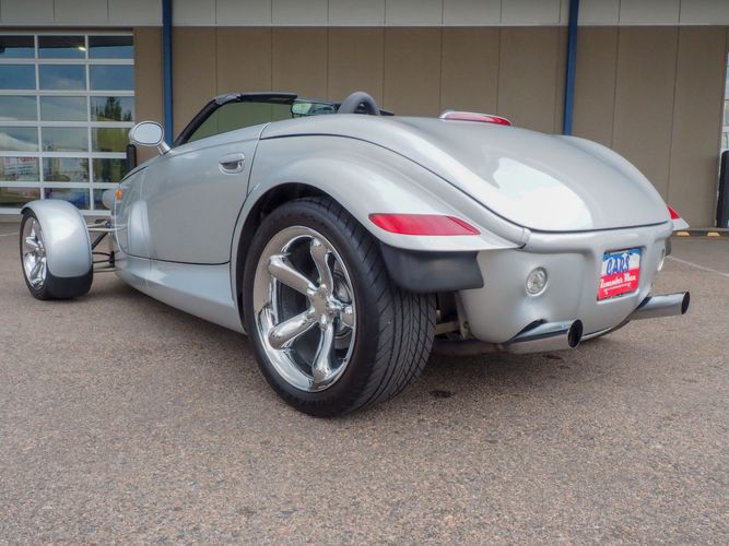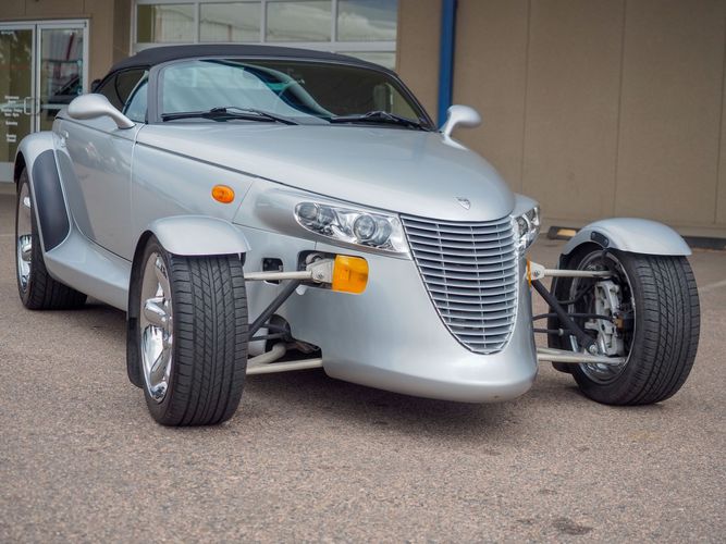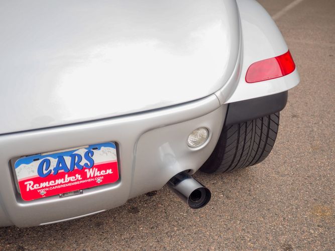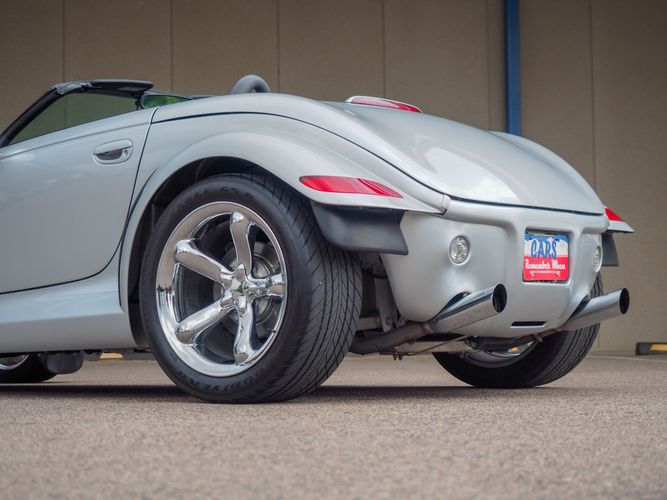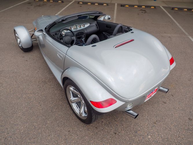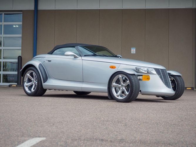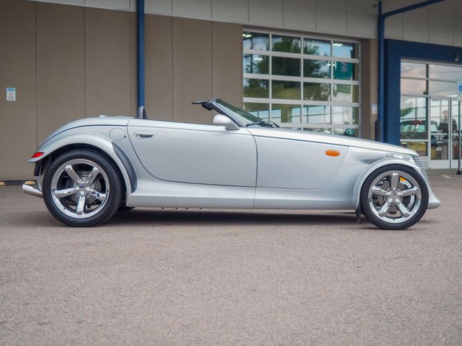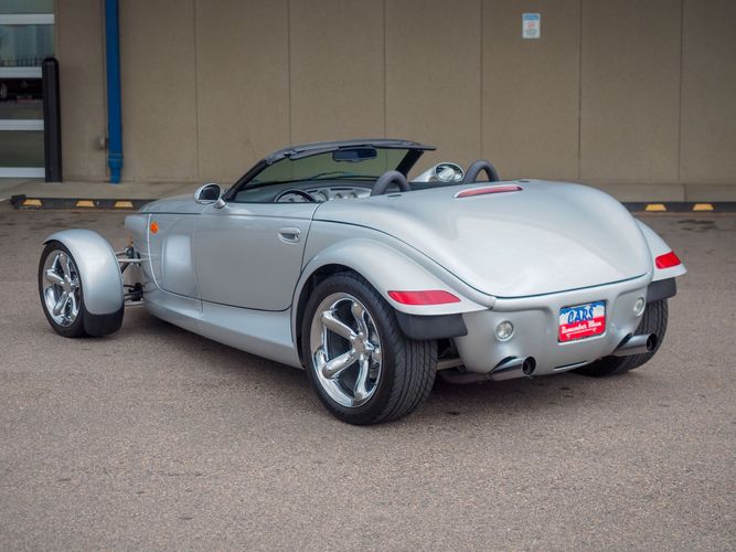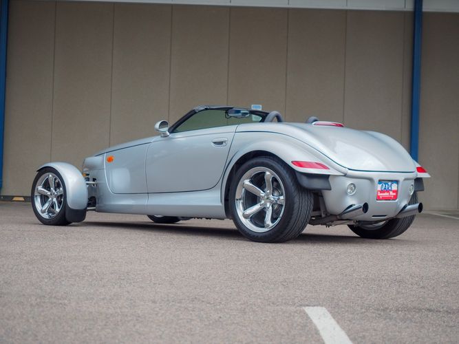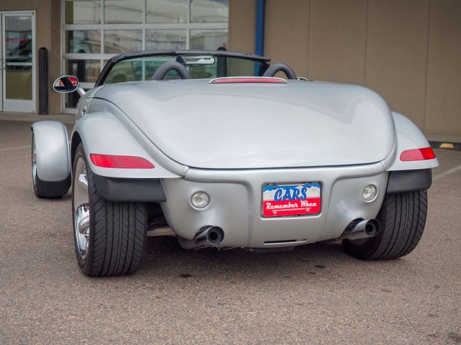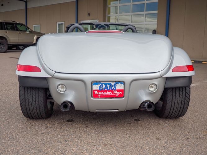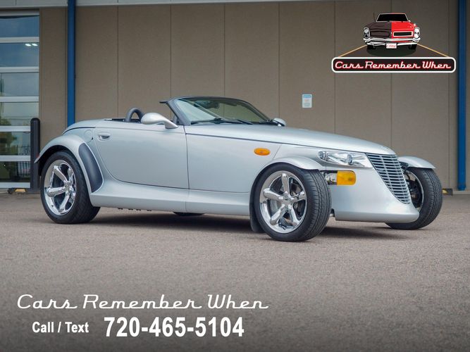 This 2000 Plymouth Prowler is finished in Prowler Silver Metallic over dark gray leather upholstery and is powered by a 3.5-liter V6 paired with a four-speed automatic transaxle. Features include a black soft top, staggered-diameter wheels, four-wheel disc brakes, air conditioning, power accessories, cruise control, a cassette stereo, and a six-disc CD changer. The odometer currently shows 17,126 miles. This prowler rides on chrome-finished 17? front and 20? rear wheels wearing Goodyear Eagle tires measuring 225/45 up front and 295/40 out back. Stopping power is provided by four-wheel disc brakes, and the car features power-assisted rack-and-pinion steering. Now offered for sale by Cars Remember When Auto Sales - Call Today 720-465-5104