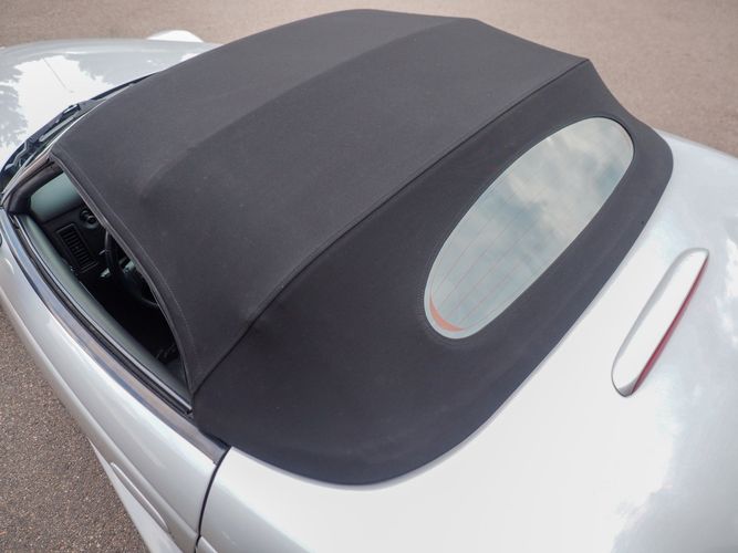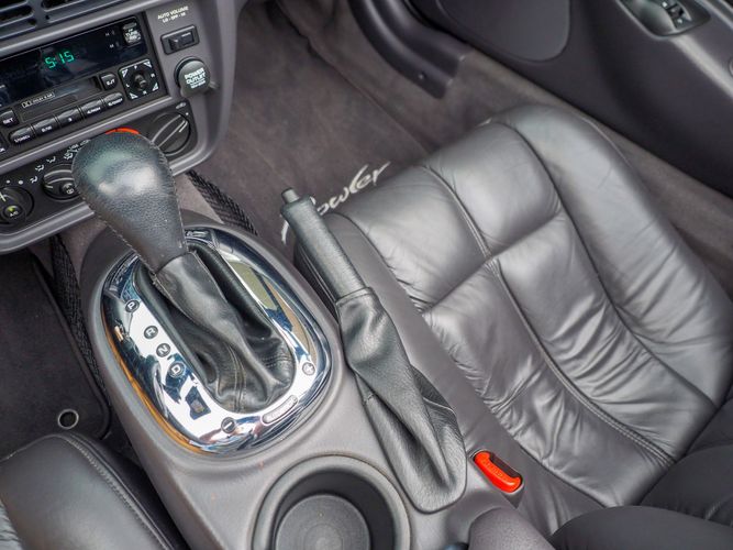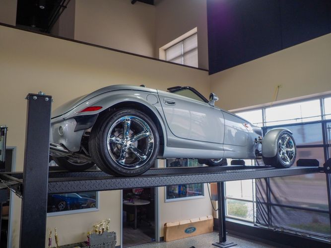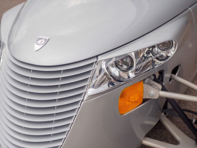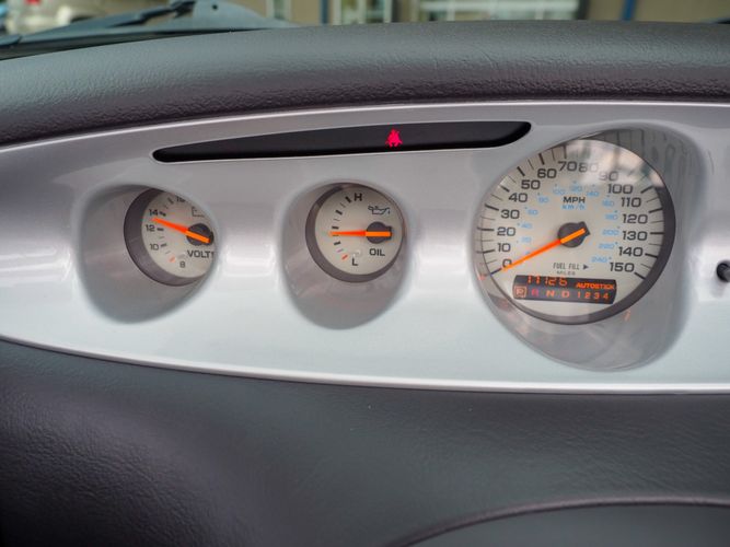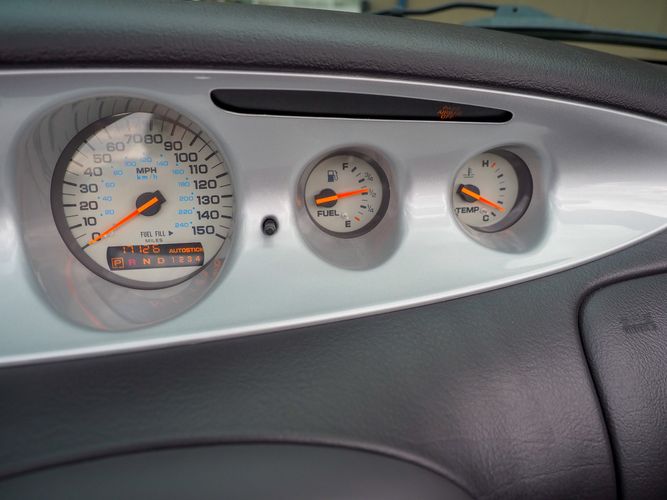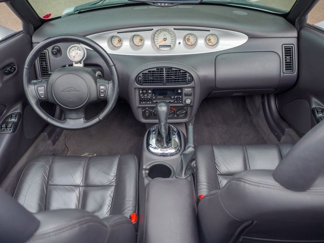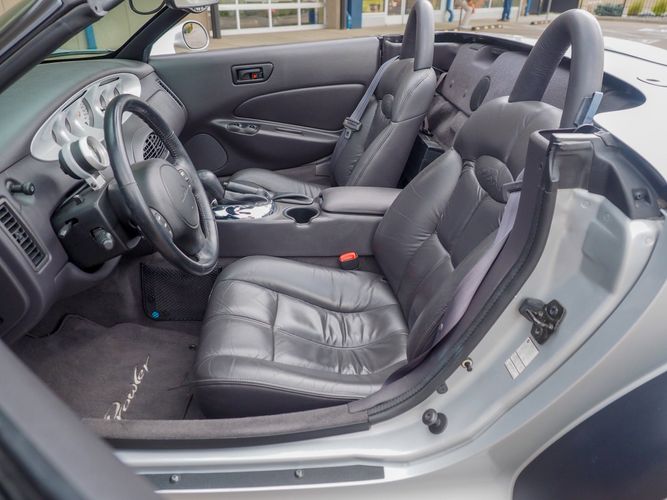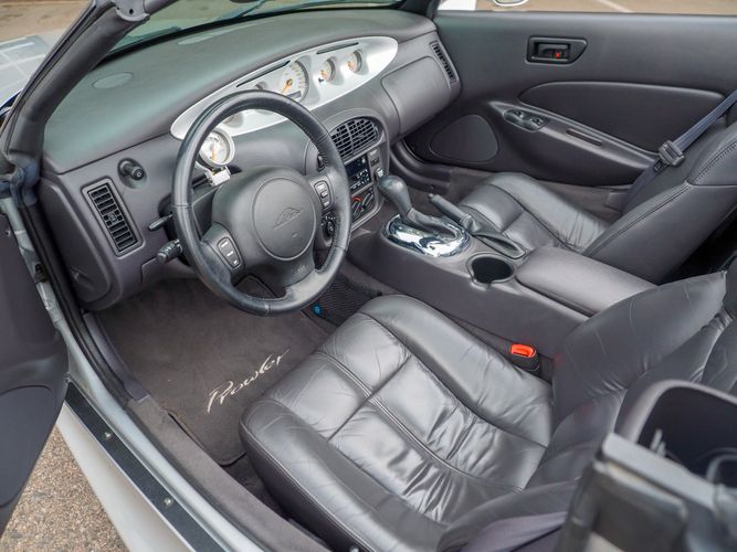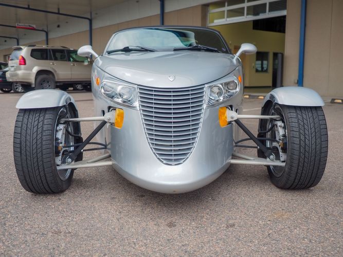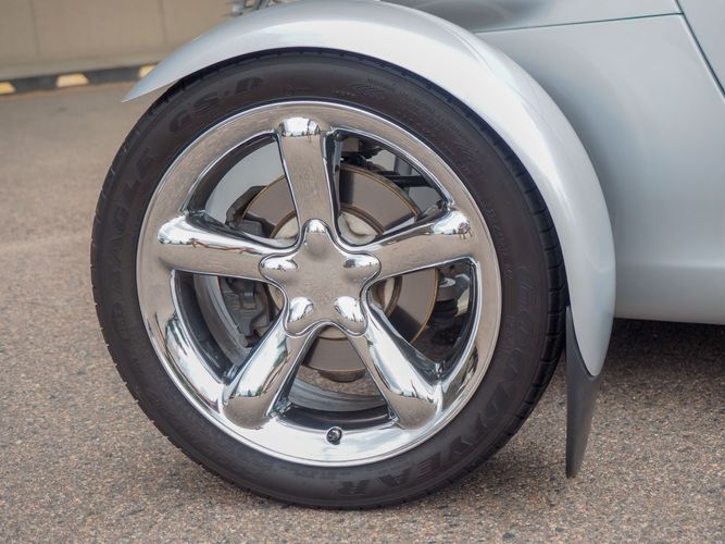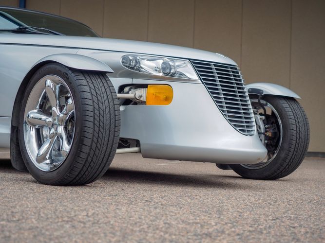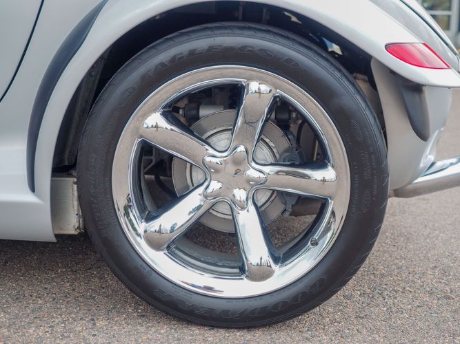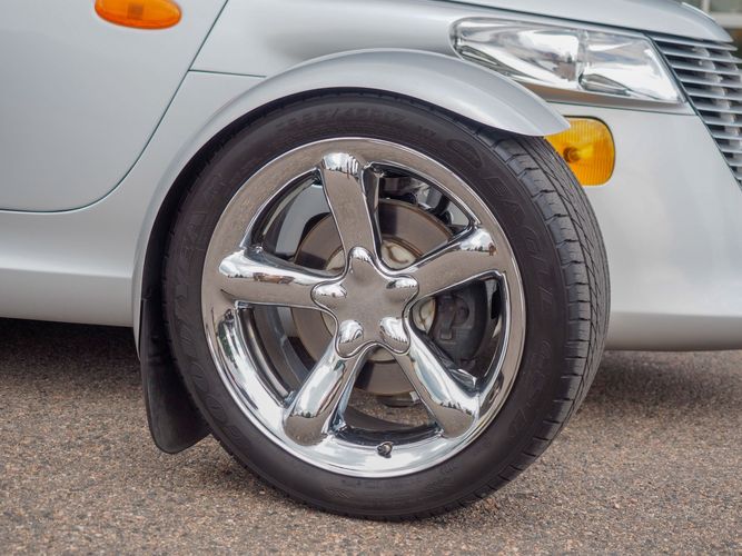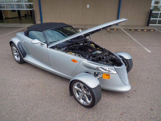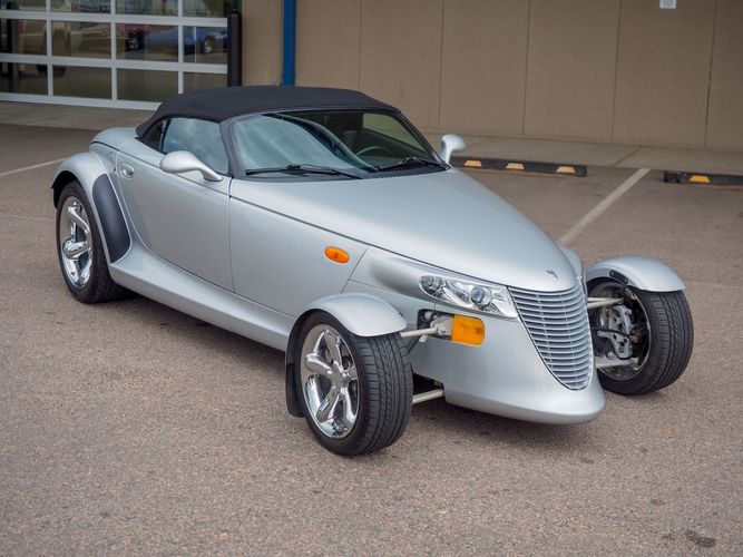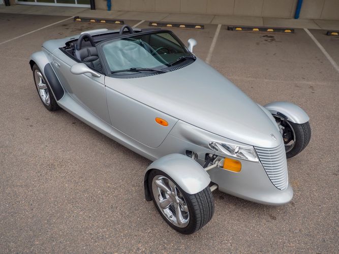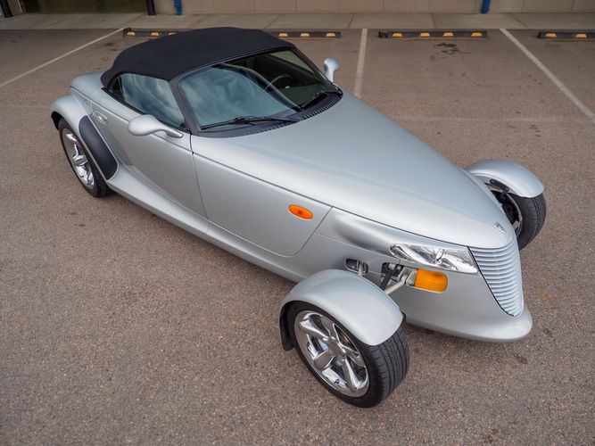 This 2000 Plymouth Prowler is finished in Prowler Silver Metallic over dark gray leather upholstery and is powered by a 3.5-liter V6 paired with a four-speed automatic transaxle. Features include a black soft top, staggered-diameter wheels, four-wheel disc brakes, air conditioning, power accessories, cruise control, a cassette stereo, and a six-disc CD changer. The odometer currently shows 17,126 miles. This prowler rides on chrome-finished 17? front and 20? rear wheels wearing Goodyear Eagle tires measuring 225/45 up front and 295/40 out back. Stopping power is provided by four-wheel disc brakes, and the car features power-assisted rack-and-pinion steering. Now offered for sale by Cars Remember When Auto Sales - Call Today 720-465-5104